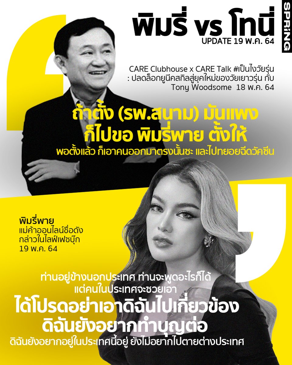 พิมรี่พาย วอนอดีตนายกรัฐมนตรี ทักษิณ ชินวัตร หรือ โทนี่ วูดซัม งดลากตนไปเกี่ยวข้องหรือใช้เป็นเครื่องมือเหน็บแนมผู้ทื่ไม่เห็นด้วย ลั่น. พิมรี่พาย ไลฟ์เสียงสั่น รู้มั้ย 'ทักษิณ' พูดถึงแค่ 5 วิ.ชีวิตเจออะไร. ดราม่าต่อเนื่องหลัง ทักษิณ ชินวัตร อดีตนายกรัฐมนตรี พาดพิงพิมรี่พาย ในการเสวนา care clubhouse x care talk #เป็นไงวัยรุ่น : พิมรี่พาย ลั่น ยังอยากอยู่ในประเทศ ขอ ทักษิณ อย่าใช้เป็นเครื่องมือ. ล่าสุด พิมรี่พาย ได้ออกมาพูดถึงประเด็นดังกล่าวระหว่างไลฟ์สดขายของ ว่า อยากจะฝากถึงคุณทักษิณ ที่มีการพูดถึงตนในไลฟ์สดเมื่อคืน ท่านอยู่.